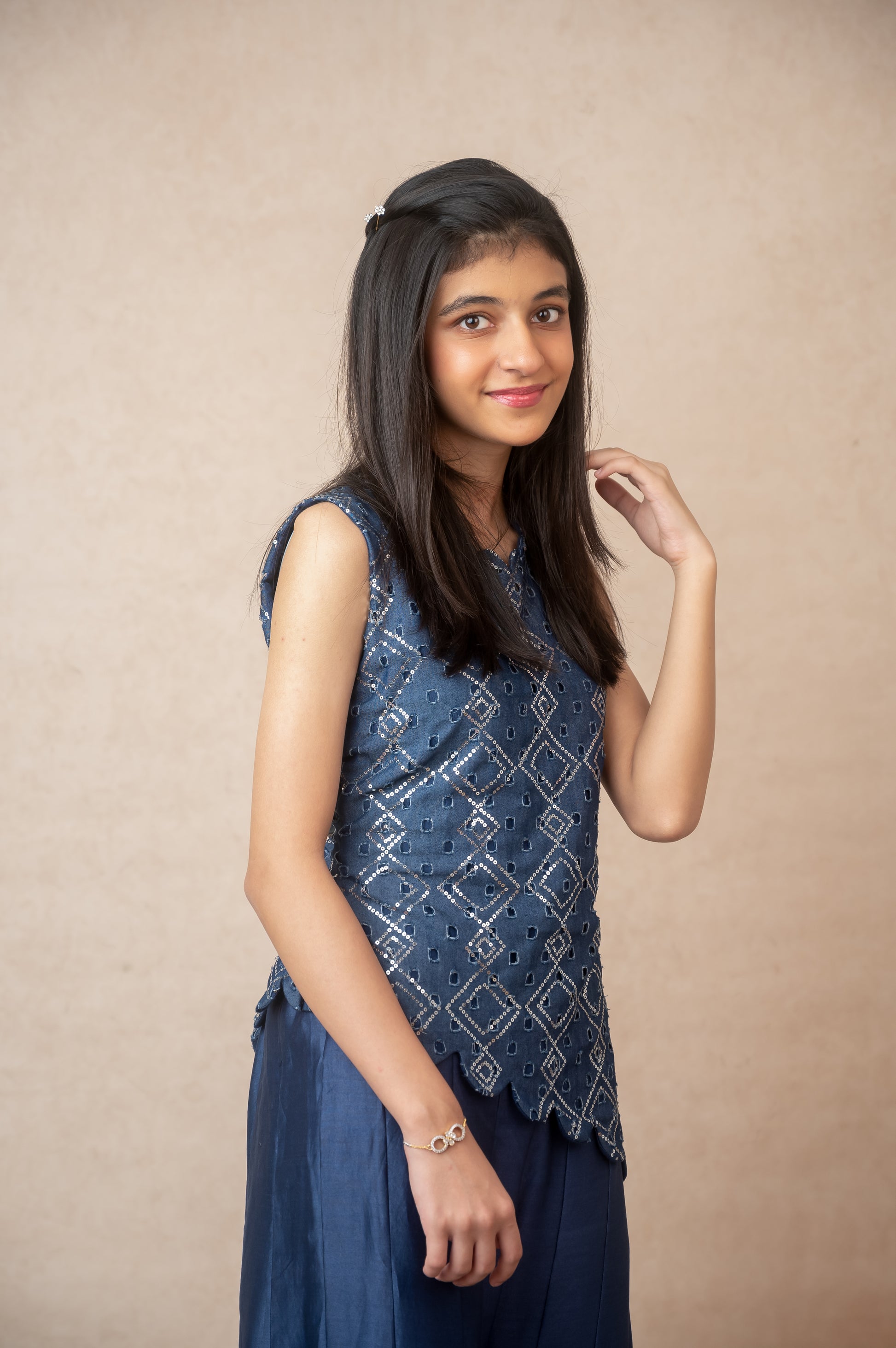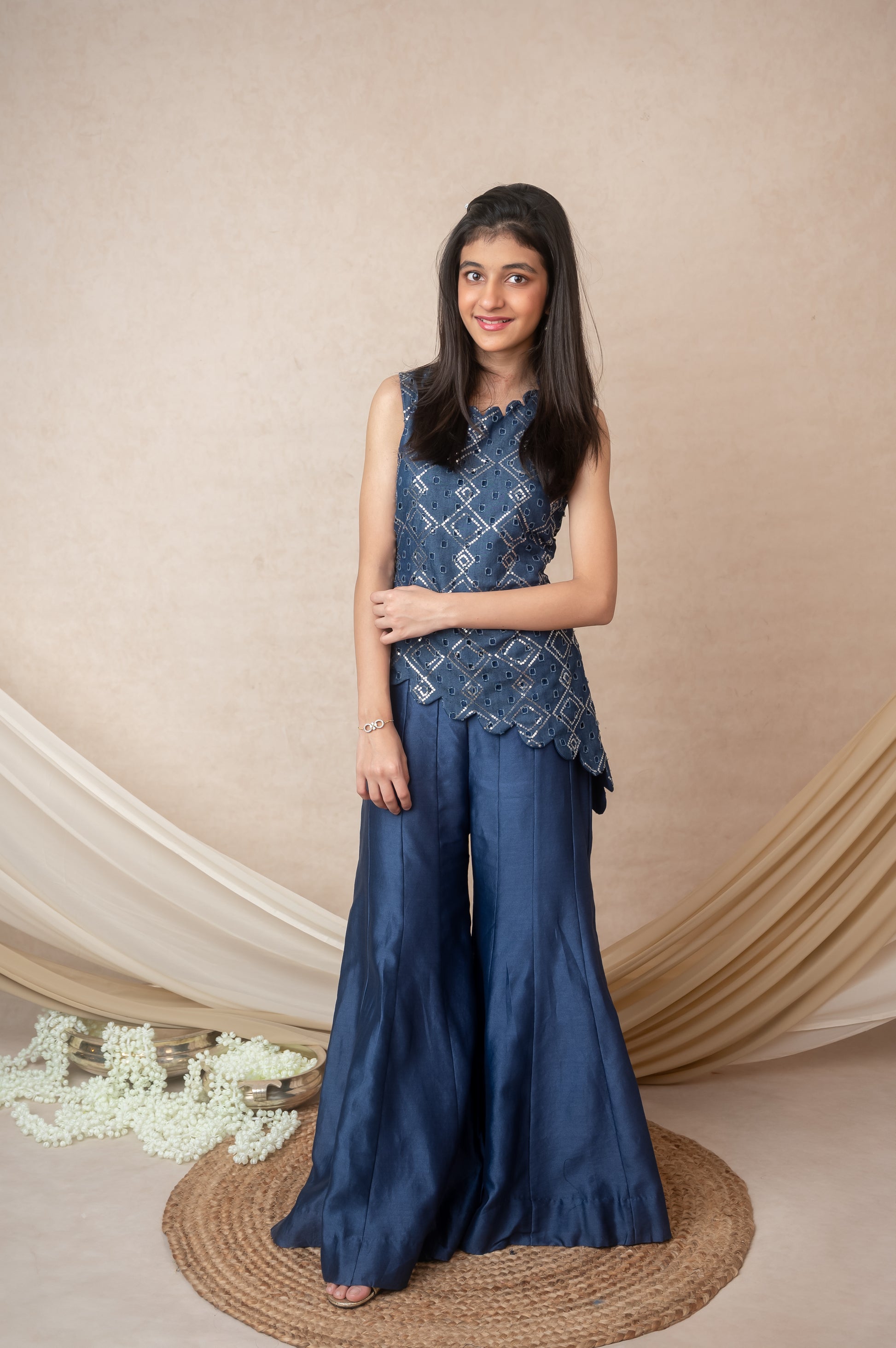 A stylish fusion of edgy and ethnic, this outfit features an asymmetric cutwork denim top highlighted with sequins and a delicate scallop finish. The sleeveless silhouette and back zip closure make it easy to wear while maintaining a sharp look. Paired with a kali-fitted palazzo crafted in chanderi, this blue ensemble is lined with soft taffeta for extra comfort. Perfect for occasions where you want your little one to stand out with a modern twist on traditional wear.