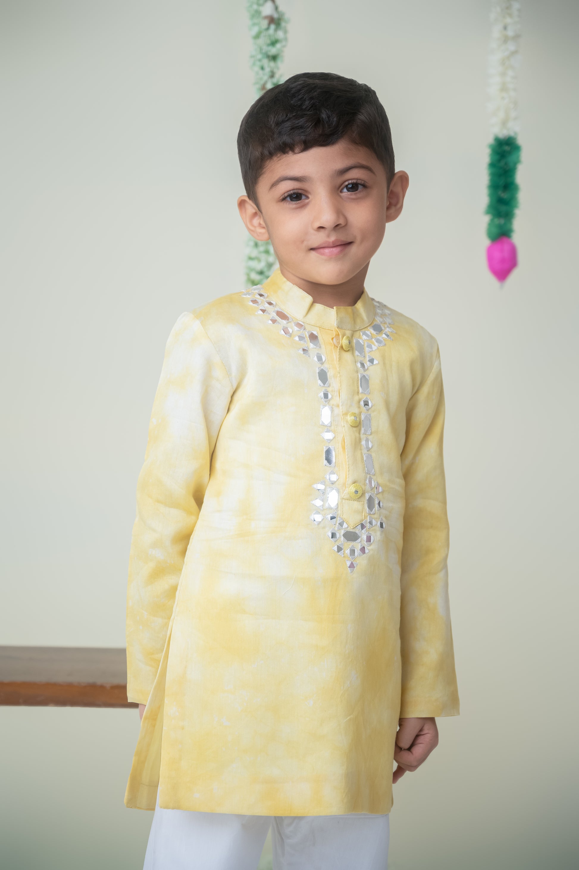 Elegant and traditional, this kurta set is crafted in fine Chanderi with batik print, highlighted by delicate mirror embroidery around the collar. Paired with a classic cotton silk pyjama, this outfit is perfect for festive occasions, weddings, or family celebrations, ensuring your little one looks sharp and stylish.