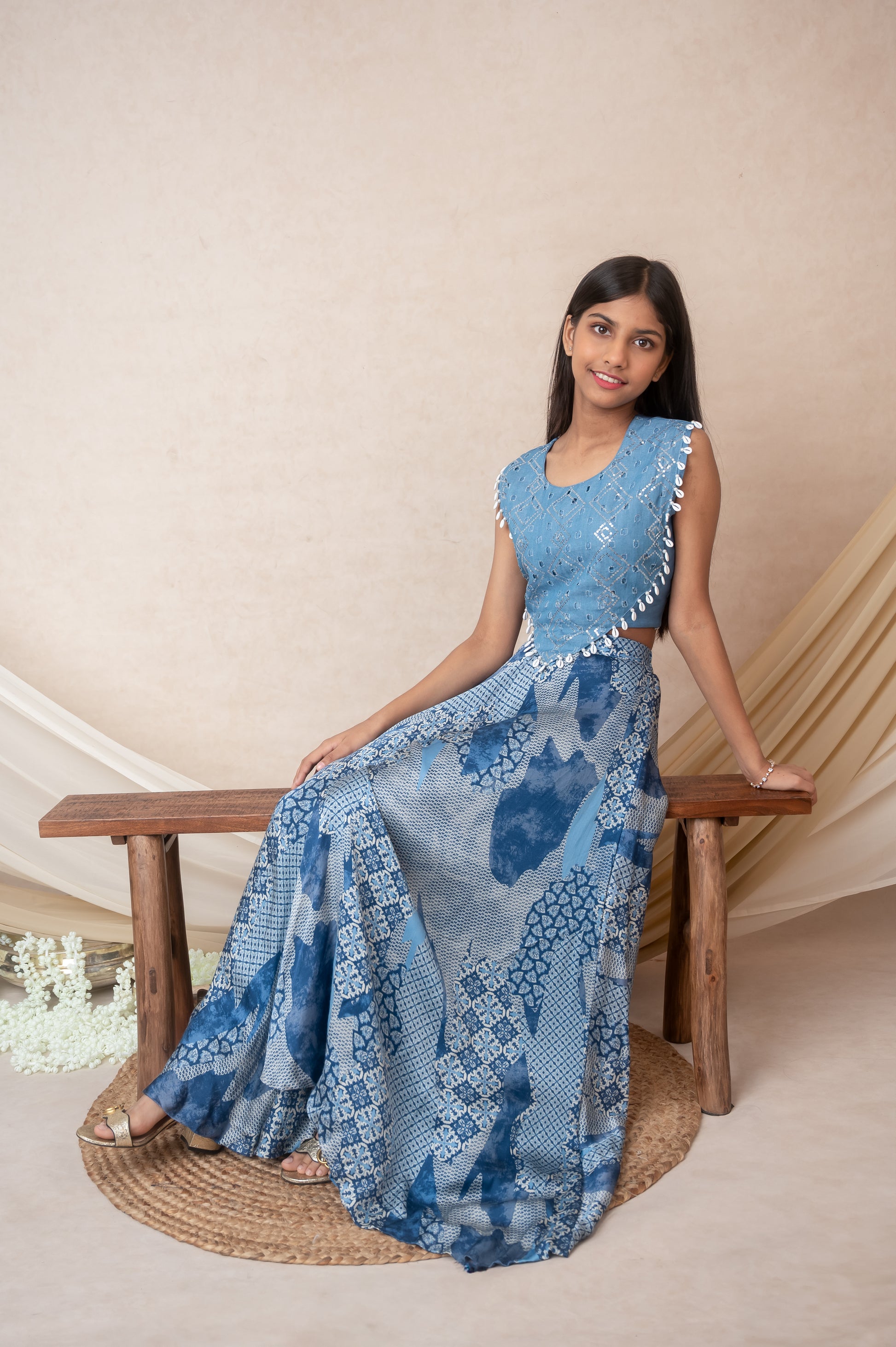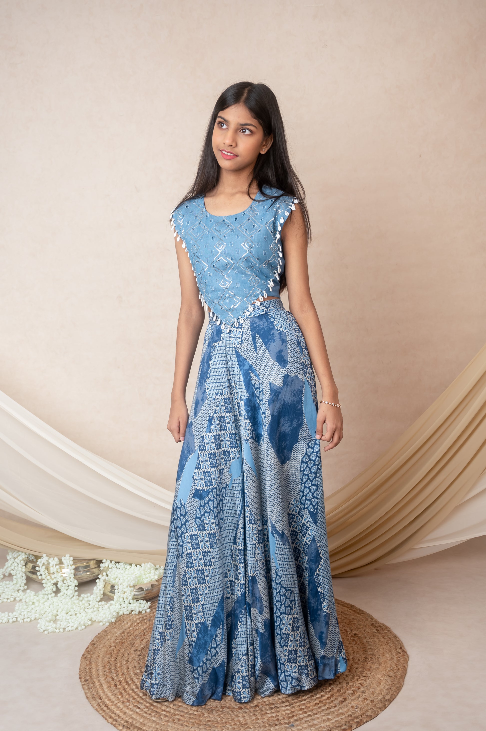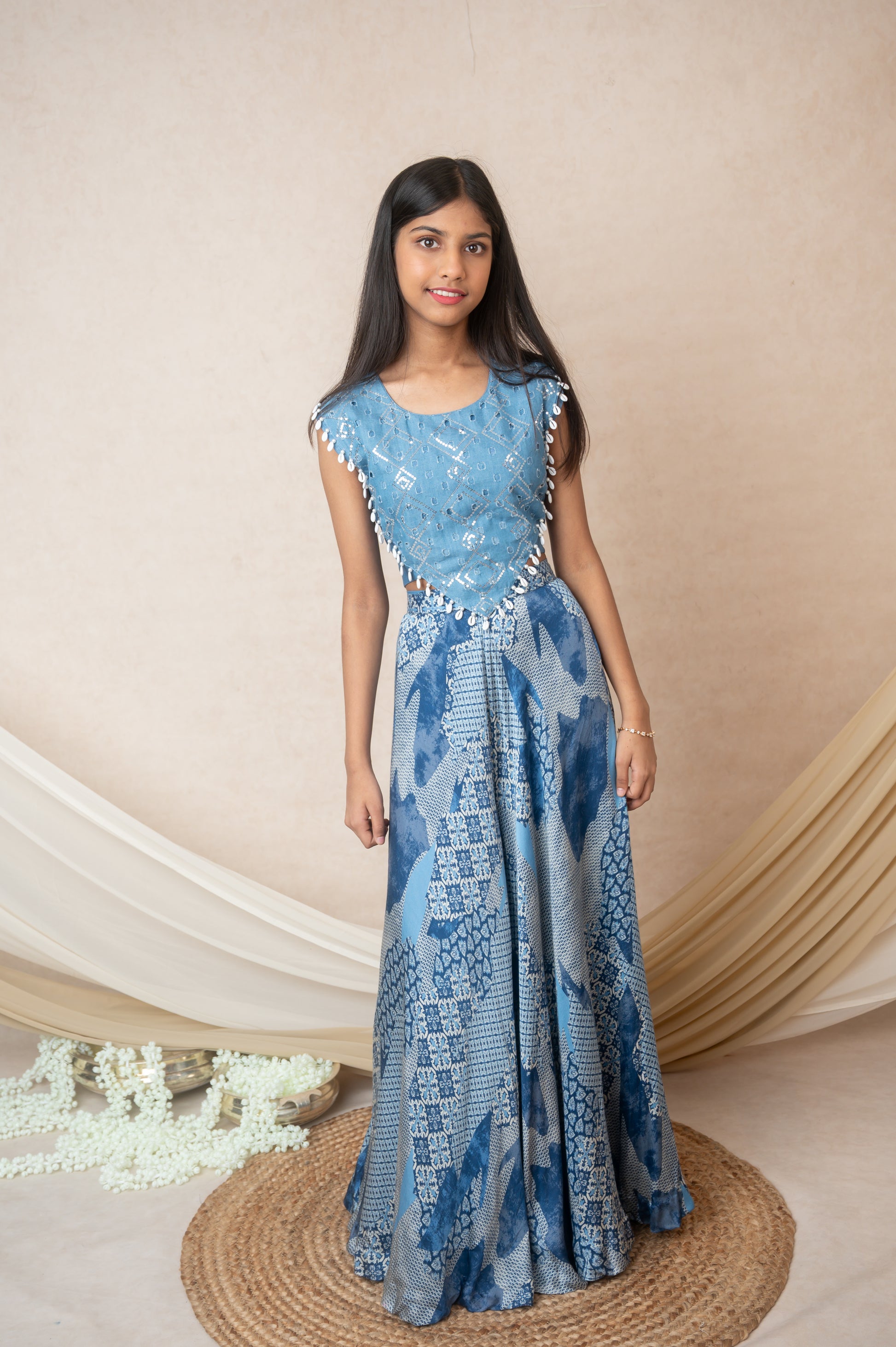 Fabric: Denim, silk, and printed muslin Top: Round neck with denim yolk embellished with sequins, moti, shell tassels Sleeves: Sleeveless Top Closure: Back hooks Bottom: Flared palazzo Color: Blue Lining: Soft taffeta Size Reference: This image shown is for 14 yearsCare Instructions: Dry clean only Made in India