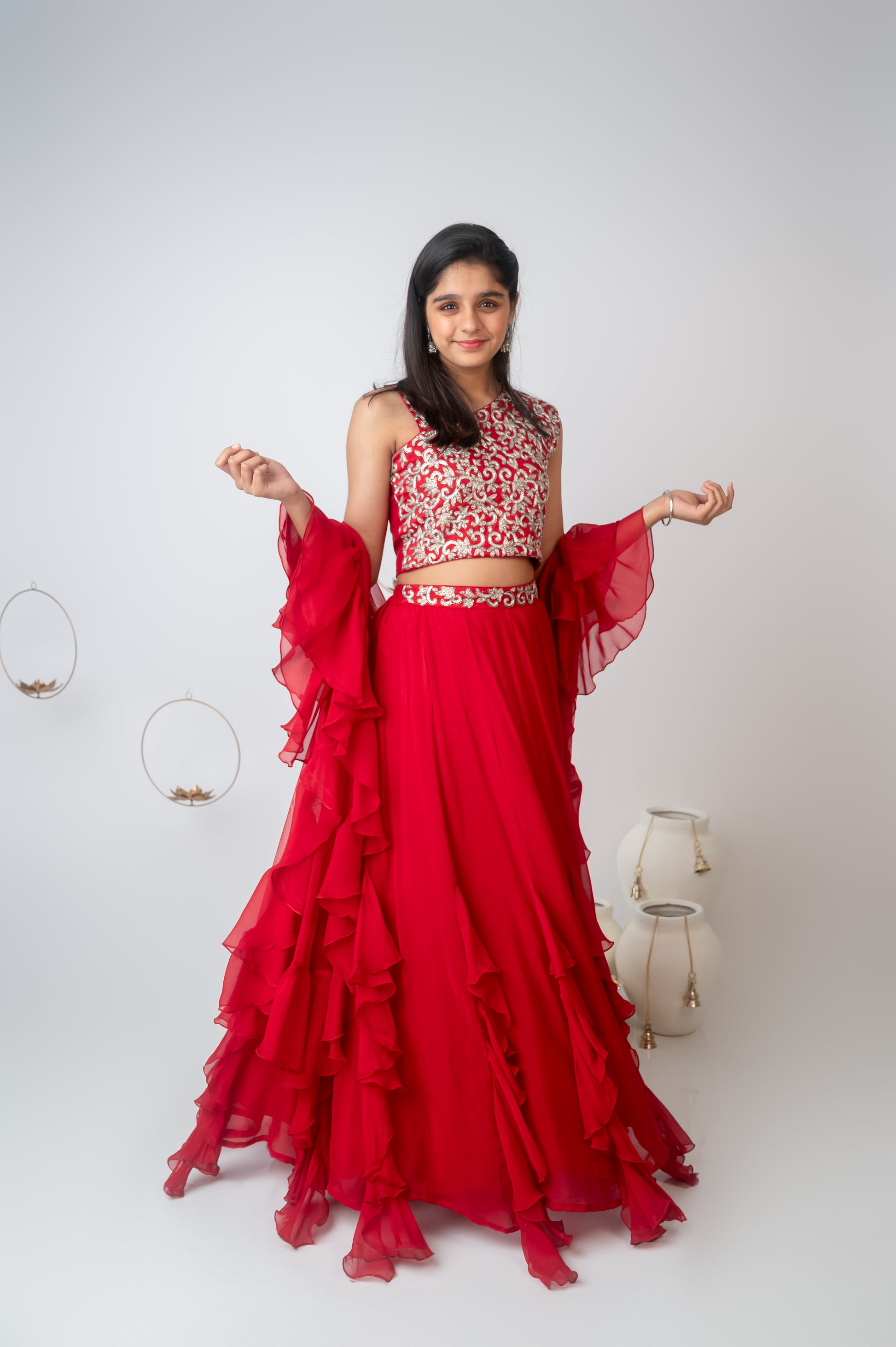 Turn heads at every celebration with this elegant red ensemble crafted in a blend of organza and Russian silk. The one-shoulder top is delicately hand-embroidered and designed with a thin strap and side zip closure for ease and comfort. It comes with a unique frill-style dupatta and a layered skirt featuring an intricately embroidered belt. Lined with soft taffeta and made in India, this outfit brings together tradition and modern charm for your little one.