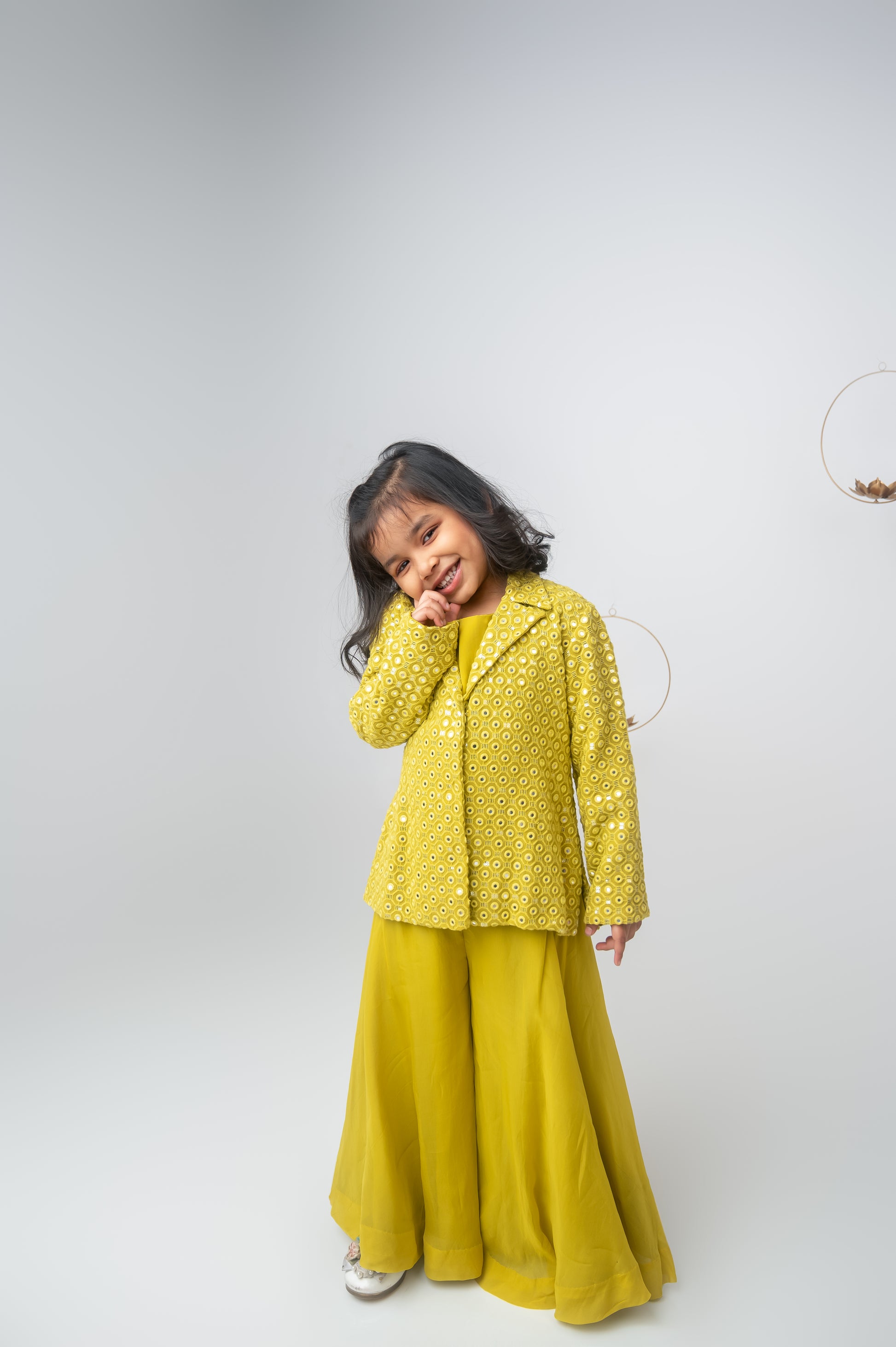 A graceful fusion of elegance and flair, this yellowish-green ensemble features a sleeveless georgette top with a round neck and back hook closure, layered under a stunning organza mirror-work jacket with a structured collar and full sleeves. The front-hook jacket adds a festive sparkle, perfectly paired with flowy palazzos for a breezy finish. Lined with soft taffeta for comfort, this outfit is ideal for special celebrations and events.